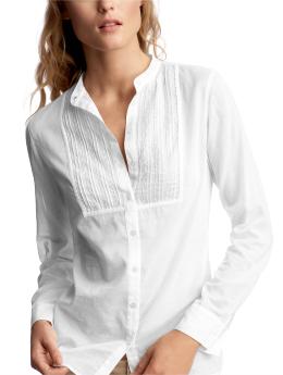 - Long sleeves with button cuffs, mandarin collar, button front.