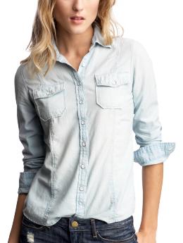 - High-quality chambray woven cotton shirt with topstitching throughout.